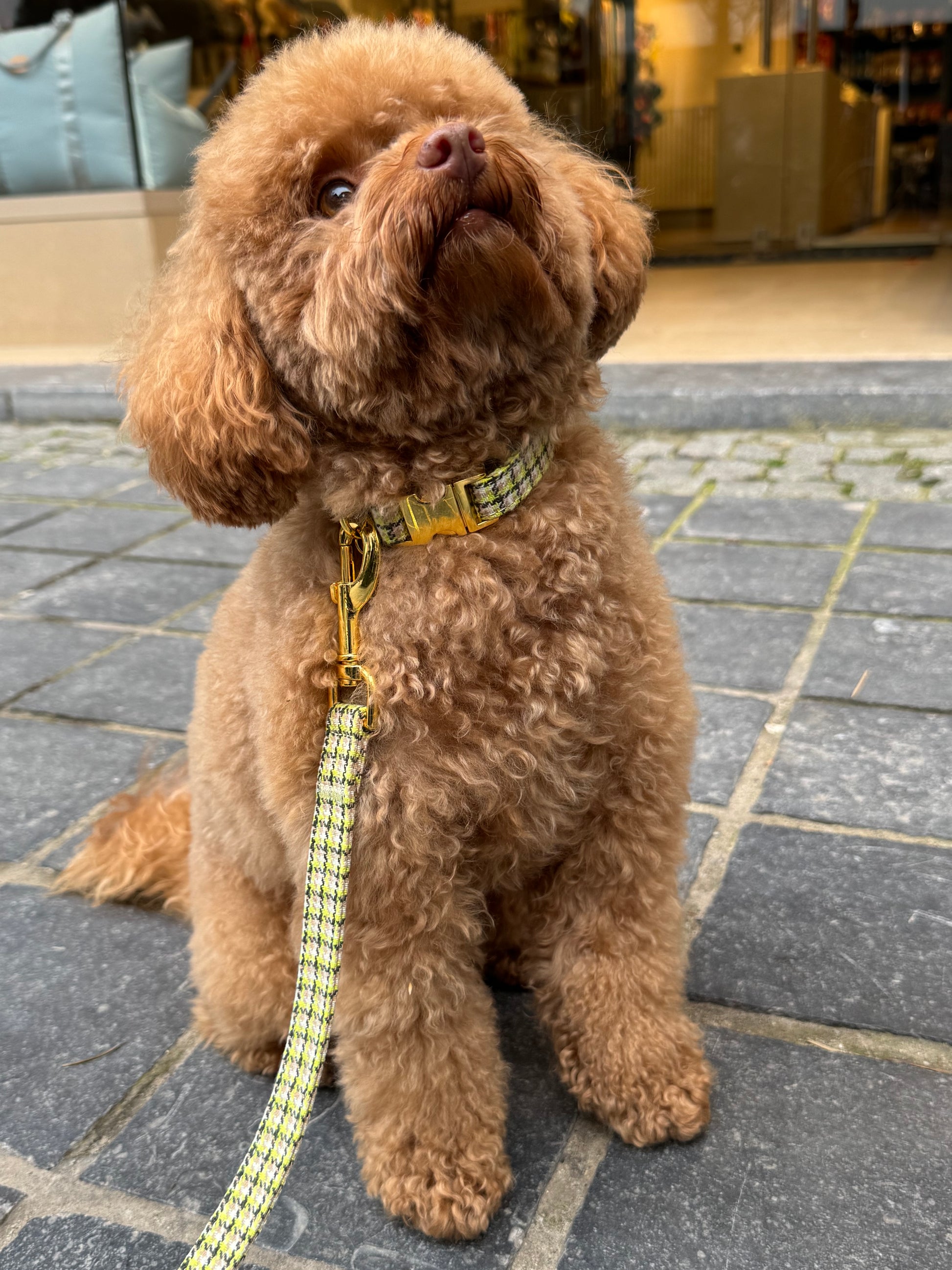 The Carré collar is designed for those who love timeless elegance with a soft twist. The woven texture, refined colors and gold-toned details create a collar that effortlessly combines style and functionality, perfect for everyday walks as well as special moments.